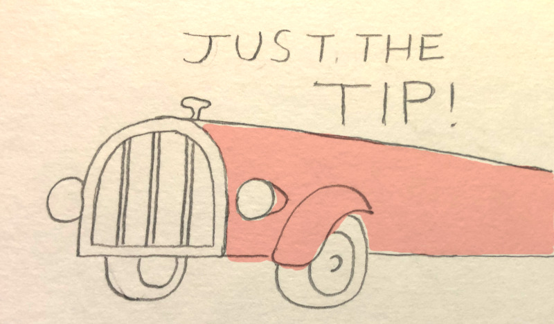 “I put it into eighth gear (N.B. Sorry, I still don’t know cars), and slammed on the gas, pushing the engine to the breaking point. Less than a hundred meters from the finish line, my Bugatti 55 responded to my recklessness by turning into the other type of vehicle, a tractor. Why do cars always do that just when the race is getting good?”
