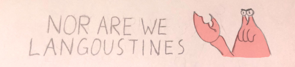 “We are not clams, with our foolish shells dug into the sand. We are not shrimp… the name itself says it all. We are not crabs, a frivolous group of creatures too disorganized and weak to achieve victory. We are lobsters.”