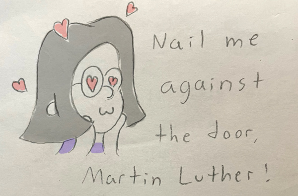 Alas, it was not to be. Asgarde’s Jesus is very much the Jesus of kitsch and cliche, like unicorns or Coca Cola Santa. This is a literary figure that has been tossed into the laps of our collective cultural literacy by tradition, and you don’t ask why he’s washing somebody’s feet any more than you ask why leprechauns have pots of gold. This gives a certain randomness to the sequence of events. There’s a sermon and a mount, of course. But you’re not going to see Jesus toss a herd of pigs off a cliff, because nobody really remembers that part. There’s also a curious sort of modern agnosticism about Jesus’s ministry, but projected back onto what were presumably solid facts at one point. For example, J. C. admits that he doesn’t really know exactly what he’s preaching, or if anyone should try to know; they’re just “fables” to be loosely interpreted, like he’s a beat poet.